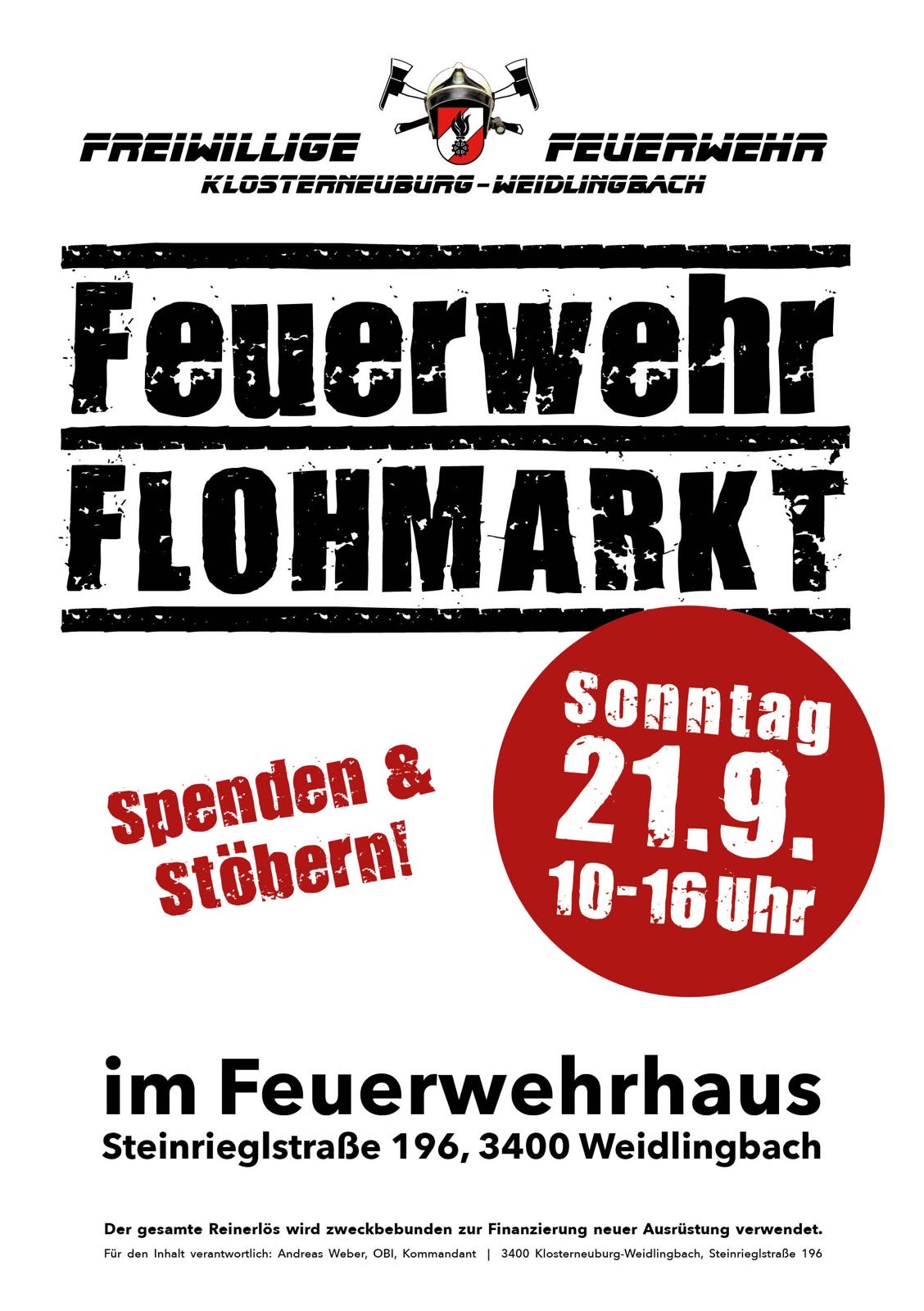 Feuerwehr Flohmarkt Weidlingbach Datum Sonntag 21.09.25 10:00 – 16:00 Zum Kalender hinzufügen ICS herunterladen Google Kalender iCalendar Office 365 Outlook Live Veranstaltungsinfo 🚒 Feuerwehr-Flohmarkt in Weidlingbach! 📅 21.09.2025 | ⏰ 10–16 Uhr 📍 Steinrieglstraße 196, Klosterneuburg-Weidlingbach Highlight: Wunderschöne Sachspenden direkt von unseren Nachbarn ✨ 👉 Wir freuen uns auf euch! Veranstaltungsort 3400 Klosterneuburg 3400 Klosterneuburg (Niederösterreich) Diesen Ort auf der Karte anzeigen Weitere Veranstaltungen anzeigen Veranstaltungstyp Flohmarkt Vereinsflohmarkt QR-Code zur Veranstaltung Flyer Flyer anschauen (vergrößern) Bilder Flohmarktkalender Österreich – Flohmarktkalender.at Alle Angaben sind ohne Gewähr von Richtigkeit und Vollständigkeit. Information drucken oder teilen