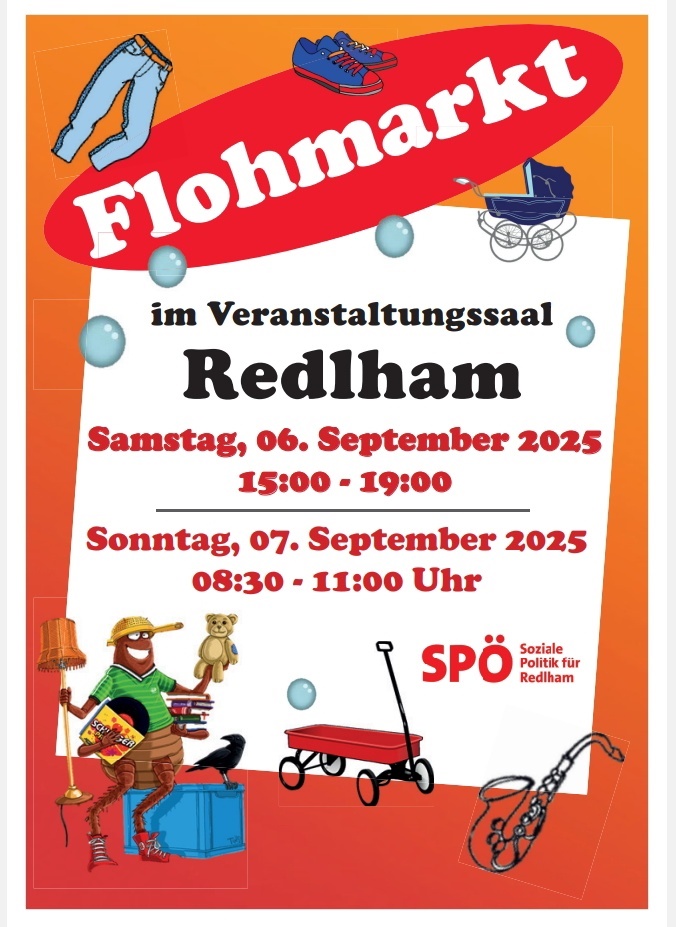 Flohmarkt der SPÖ Redlham Datum Sonntag 07.09.25 08:30 – 11:00 Zum Kalender hinzufügen ICS herunterladen Google Kalender iCalendar Office 365 Outlook Live Veranstaltungsinfo Flohmarkt der SPÖ Redlham am Samstag 06.09,2025 von 15:00 bis 19:00 Uhr und am Sonntag 07.09.2025 von 08:30 bis 11:00 Uhr. Veranstaltungsort: Veranstaltungssaal- Redlham 2, 4846 Redlham Veranstaltungsort 4846 Redlham 4846 Redlham (Oberösterreich) Diesen Ort auf der Karte anzeigen Weitere Veranstaltungen anzeigen Veranstaltungstyp Flohmarkt QR-Code zur Veranstaltung Flyer Flyer anschauen (vergrößern) Bilder Flohmarktkalender Österreich – Flohmarktkalender.at Alle Angaben sind ohne Gewähr von Richtigkeit und Vollständigkeit. Information drucken oder teilen