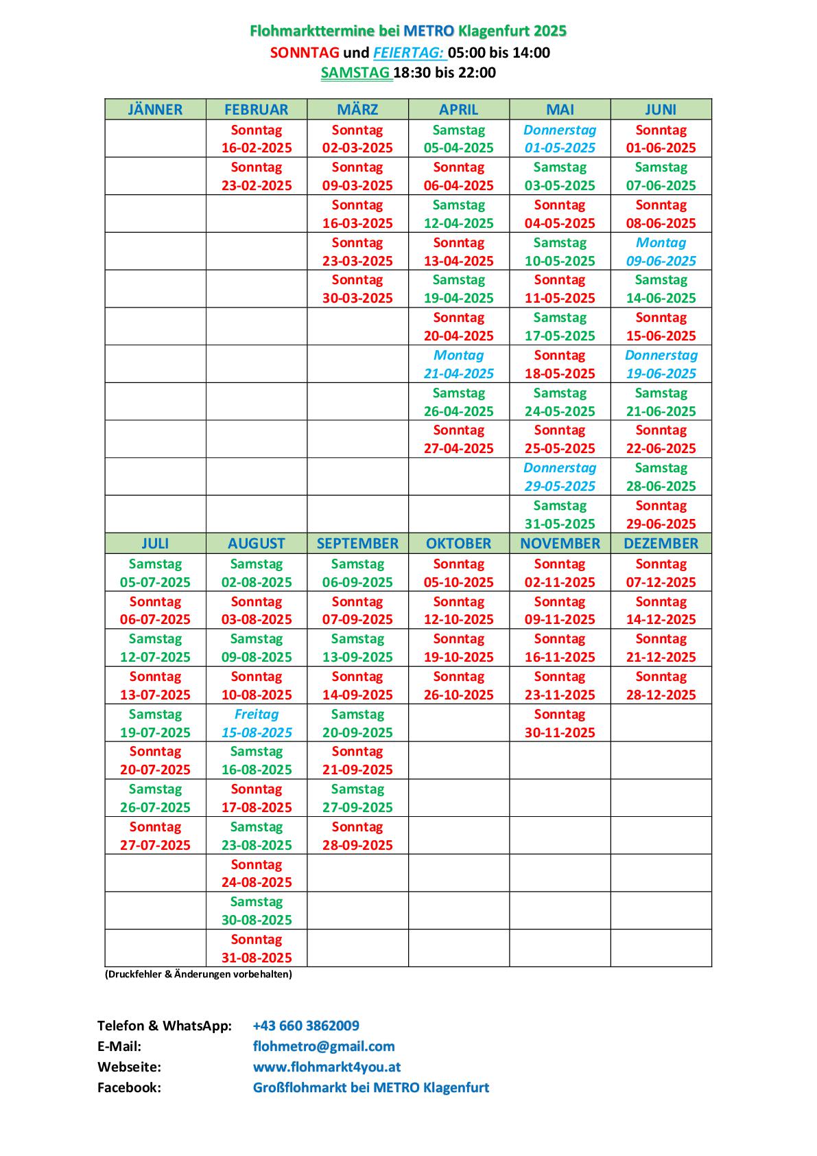 es ist soweit! Der Großflohmarkt beim METRO in Klagenfurt startet wieder am 16. Februar. Freut euch auf eine riesige Auswahl an Schnäppchen, Raritäten und besonderen Fundstücken. Egal, ob ihr auf der Suche nach Vintage-Schätzen, Alltagsgegenständen oder einzigartigen Sammlerstücken seid – hier werdet ihr fündig!