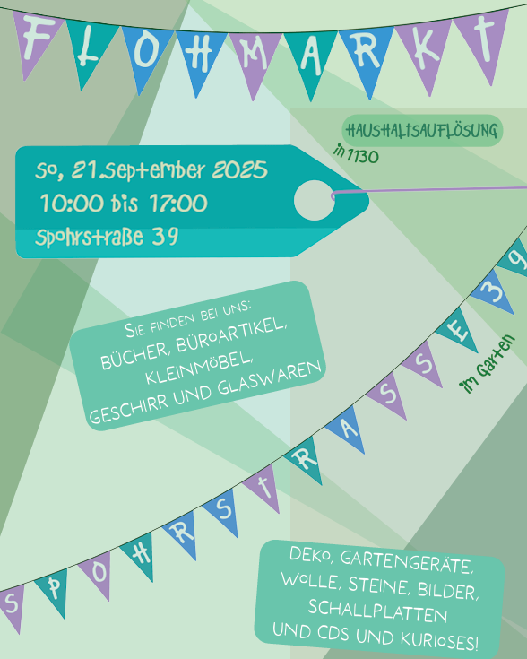 Hausflohmarkt in Hietzing Datum Sonntag 21.09.25 10:00 – 17:00 Zum Kalender hinzufügen ICS herunterladen Google Kalender iCalendar Office 365 Outlook Live Veranstaltungsinfo Hausflohmarkt in Hietzing – 13. Bezirk Wo? Spohrstraße 39, 1130 Wien (10 min von U4-Station Unter St. Veit, 2 min von 10er-Endstation Unter St. Veit, Hummelgasse) Was gibt es? Bücher Büroartikel Kleinmöbel Geschirr & Glaswaren Gartengeräte & Elektrogeräte Schallplatten, CDs & Kurioses! Veranstaltungsort 1130 Wien – Hietzing 1130 Wien (Wien) Diesen Ort auf der Karte anzeigen Weitere Veranstaltungen anzeigen Veranstaltungstyp Bücherflohmarkt Flohmarkt Garagenflohmarkt Haus- & Wohnungsflohmarkt Möbelflohmarkt Wohnungsflohmarkt QR-Code zur Veranstaltung Flyer Flyer anschauen (vergrößern) Bilder Flohmarktkalender Österreich – Flohmarktkalender.at Alle Angaben sind ohne Gewähr von Richtigkeit und Vollständigkeit. Information drucken oder teilen