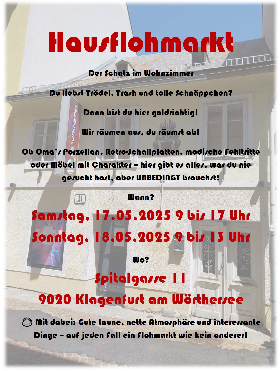 Hausflohmarkt in Klagenfurt (Innenstadt – Spitalgasse) Datum Samstag 17.05.25 09:00 – 17:00 Zum Kalender hinzufügen ICS herunterladen Google Kalender iCalendar Office 365 Outlook Live Veranstaltungsinfo Hausflohmarkt Du liebst Trödel, Trash und tolle Schnäppchen? Dann bist du hier goldrichtig! Samstag, 17.05.2025 9 bis 17 Uhr und Sonntag, 18.05.2025 9 bis 13 Uhr Spitalgasse 11, 9020 Klagenfurt am Wörthersee Mit dabei: Gute Laune, nette Atmosphäre und interessante Dinge – auf jeden Fall ein Flohmarkt wie kein anderer! Veranstaltungsort 9020 Klagenfurt am Wörthersee 9020 Klagenfurt am Wörthersee (Kärnten) Diesen Ort auf der Karte anzeigen Weitere Veranstaltungen anzeigen Veranstaltungstyp Flohmarkt Haus- & Wohnungsflohmarkt QR-Code zur Veranstaltung Flyer Flyer anschauen (vergrößern) Bilder Flohmarktkalender Österreich – Flohmarktkalender.at Alle Angaben sind ohne Gewähr von Richtigkeit und Vollständigkeit. Information drucken oder teilen