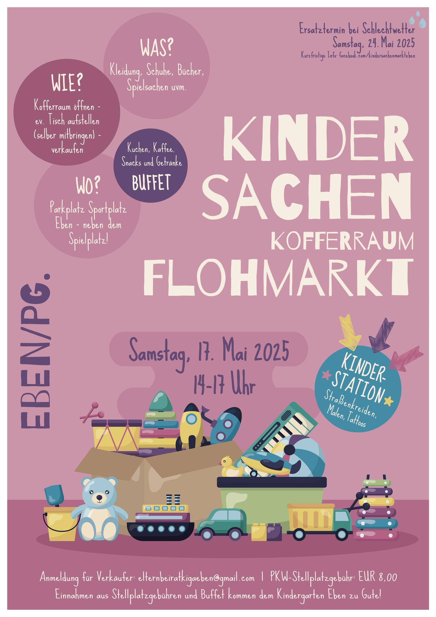 Kindersachen-Kofferraum-Flohmarkt Datum Samstag 17.05.25 14:00 – 17:00 Zum Kalender hinzufügen ICS herunterladen Google Kalender iCalendar Office 365 Outlook Live Veranstaltungsinfo Kindersachen-Kofferraum-Flohmarkt Mit KINDER-Station und BUFFET! Anmeldung für Verkäufer: elternbeiratkigaeben@gmail.com PKW-Stellplatzgebühr: EUR 8,00 Ort der Veranstaltung: Badeseestraße 300, 5531 Eben im Pongau (neben dem Spielplatz) Ersatztermin bei Schlechtwetter: 24.05.2025 Info unter: https://www.facebook.com/kindersachenmarkteben Veranstaltungsort 5531 Eben im Pongau 5531 Eben im Pongau (Salzburg) Diesen Ort auf der Karte anzeigen Weitere Veranstaltungen anzeigen Veranstaltungstyp Flohmarkt Kinderflohmarkt QR-Code zur Veranstaltung Flyer Flyer anschauen (vergrößern) Bilder Flohmarktkalender Österreich – Flohmarktkalender.at Alle Angaben sind ohne Gewähr von Richtigkeit und Vollständigkeit. Information drucken oder teilen