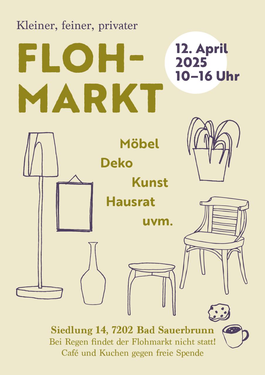 Kleiner, feiner, privater Flohmarkt Datum Samstag 12.04.25 10:00 – 16:00 Zum Kalender hinzufügen ICS herunterladen Google Kalender iCalendar Office 365 Outlook Live Veranstaltungsinfo Kleiner, feiner, privater Flohmarkt Im unserem Garten gibt es unter anderem Vintage-Schmankerl, Möbel, Deko und Kunst zu erwerben. Kaffee und Kuchen gegen freie Spende. Bei Regen findet die Veranstaltung nicht statt! Ort der Veranstaltung: Siedlung 14, 7202 Bad Sauerbrunn Kontakt: Anna Gruber, Tel: 06642009618 Veranstaltungsort 7202 Bad Sauerbrunn 7202 Bad Sauerbrunn (Burgenland ) Diesen Ort auf der Karte anzeigen Weitere Veranstaltungen anzeigen Veranstaltungstyp Flohmarkt Garagenflohmarkt Haus- & Wohnungsflohmarkt QR-Code zur Veranstaltung Flyer Flyer anschauen (vergrößern) Bilder Flohmarktkalender Österreich – Flohmarktkalender.at Alle Angaben sind ohne Gewähr von Richtigkeit und Vollständigkeit. Information drucken oder teilen