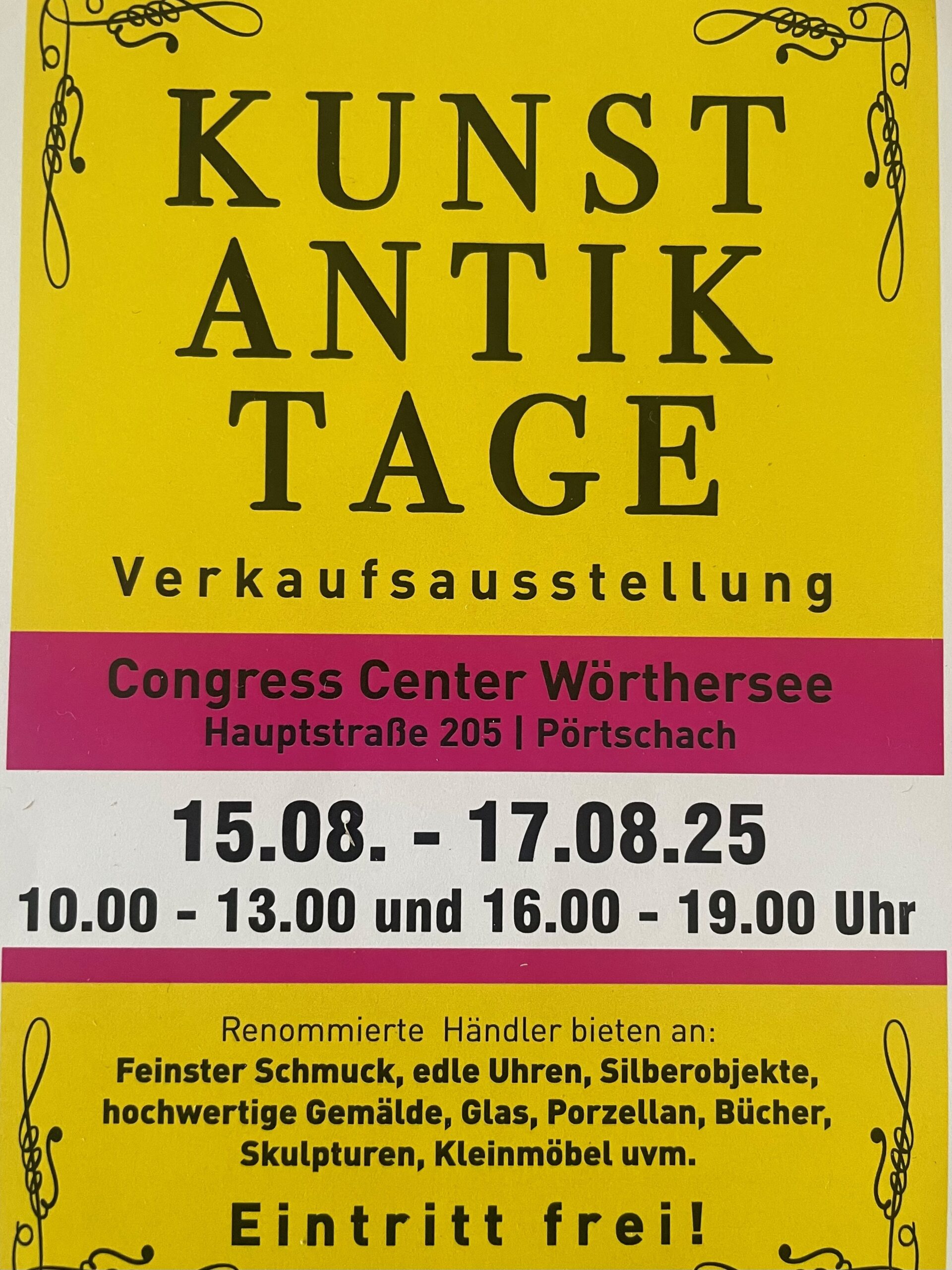 Vom 15. bis 17. August 2025, jeweils von 10:00 bis 13:00 Uhr und von 16:00 bis 19:00 Uhr finden im Congress Center in Pörtschach am Wörthersee wieder die „Kunst & Antiktage“ statt. Sie haben die einzigartige Möglichkeit Möbelstücke, antike und moderne Bilder bis hin zu Porzellan, Silberobjekte, skulpturen und Kuriositäten zu erwerben.