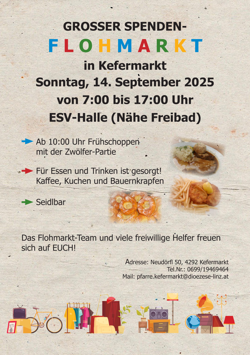 Pfarr- und Spendenflohmarkt Kefermarkt Datum Sonntag 14.09.25 07:00 – 17:00 Zum Kalender hinzufügen ICS herunterladen Google Kalender iCalendar Office 365 Outlook Live Veranstaltungsinfo Großer Pfarr- und Spendenflohmarkt Kefermarkt Ab 10:00 Uhr Frühschoppen Kaffee, Kuchen und Bauernkrapfen Für das leibliche Wohl ist bestens gesorgt. Ort: ESV-Kefermarkt, Neudörfl 3, 4292 Dörfl Veranstaltungsort 4292 Dörfl 4292 Dörfl (Oberösterreich) Diesen Ort auf der Karte anzeigen Weitere Veranstaltungen anzeigen Veranstaltungstyp Flohmarkt Pfarrflohmarkt QR-Code zur Veranstaltung Flyer Flyer anschauen (vergrößern) Bilder Flohmarktkalender Österreich – Flohmarktkalender.at Alle Angaben sind ohne Gewähr von Richtigkeit und Vollständigkeit. Information drucken oder teilen
